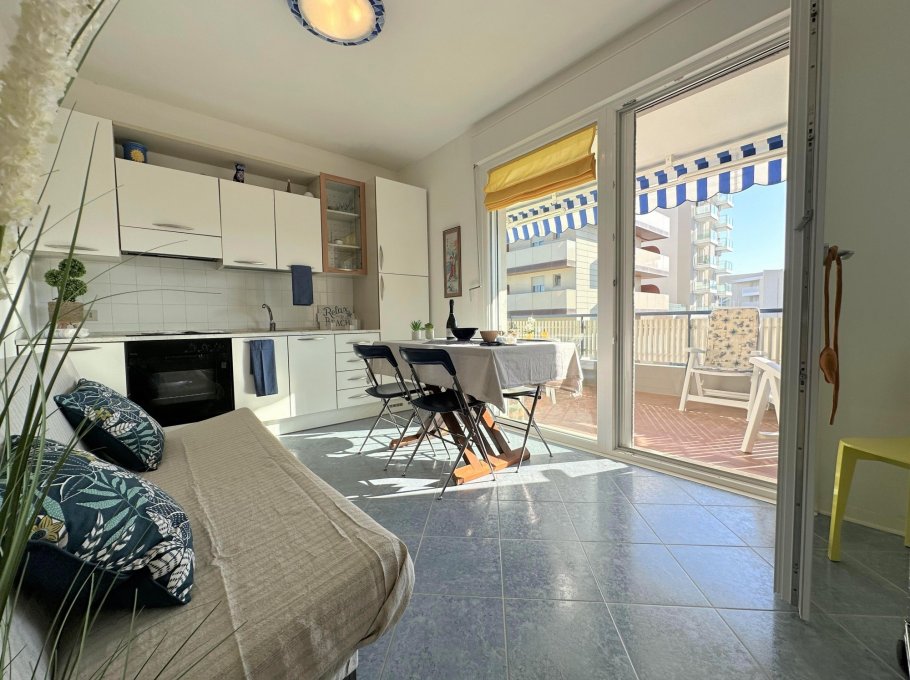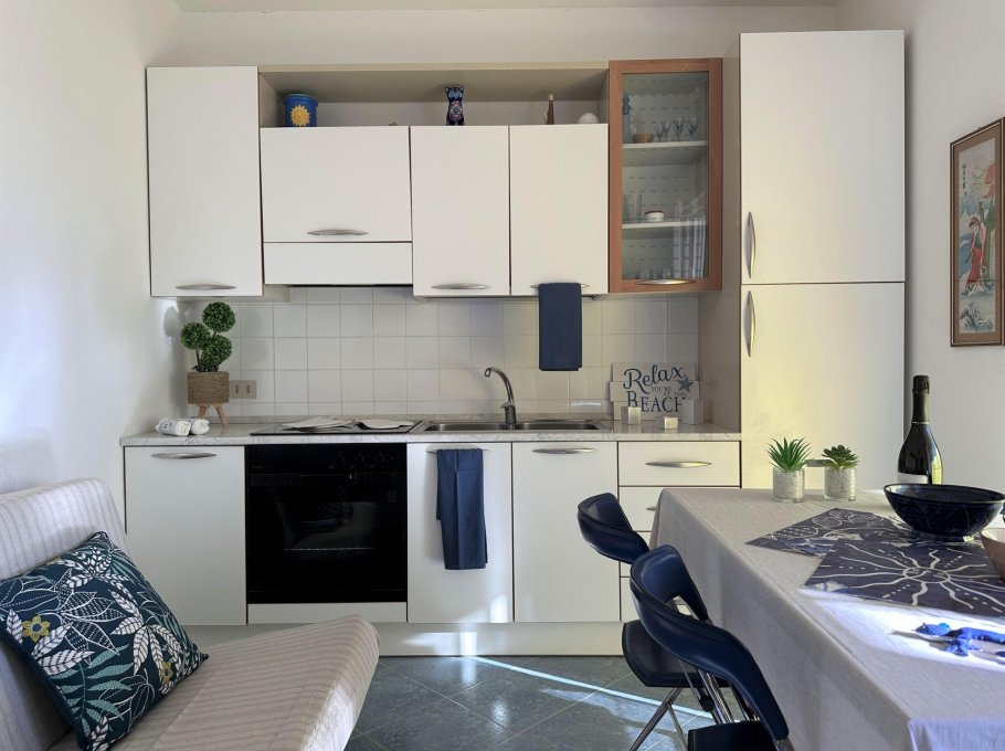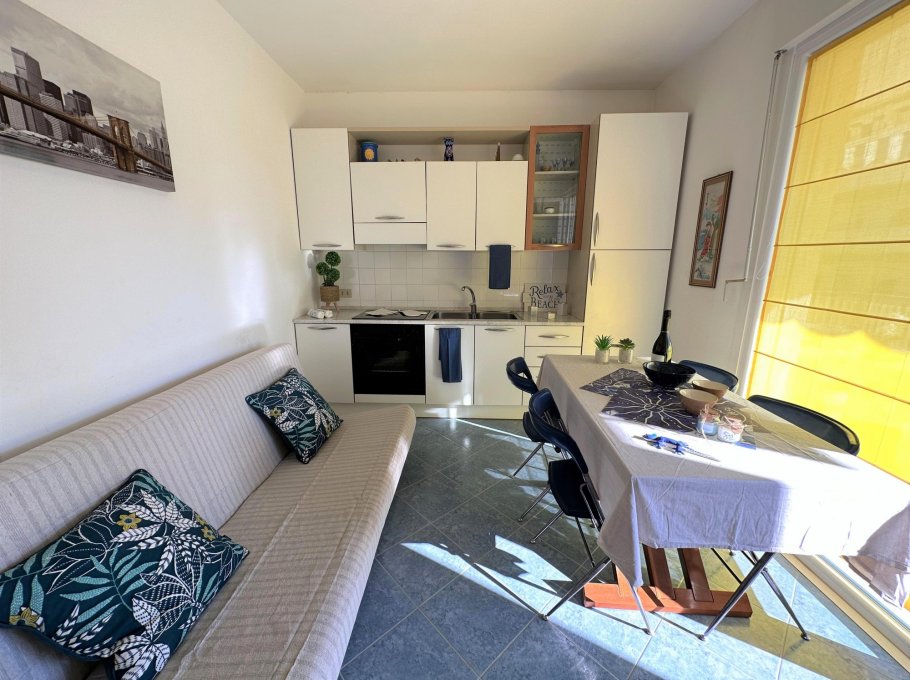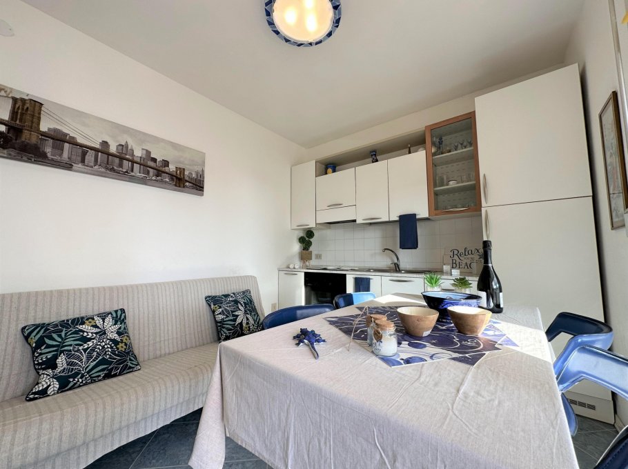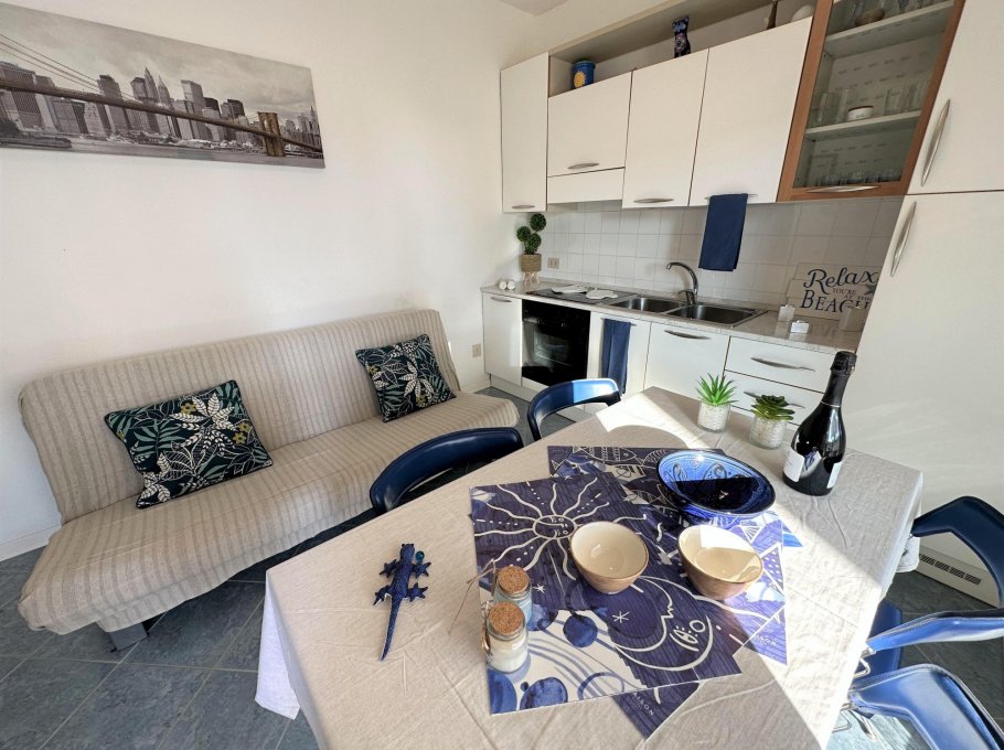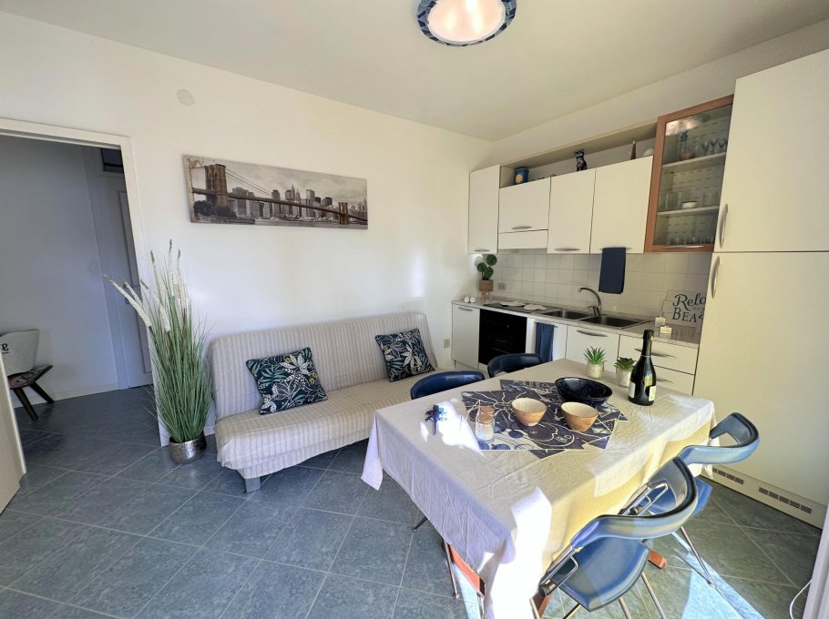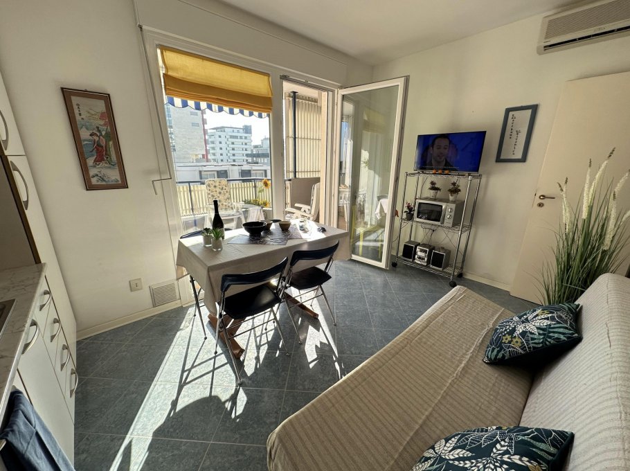 Renovated apartment located on the fourth floor and composed of a living room with kitchenette with sofa bed, large terrace with side sea view, electric awning and equipped with table and chairs.