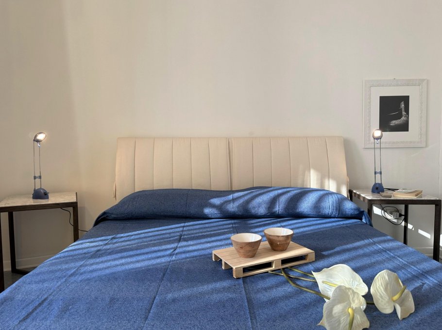 Bedroom with double bed, bedroom with single bed and high rectangular windows. Bathroom with shower. Equipped with induction hob, microwave oven, air conditioning, mosquito nets, TV and washing machine. OVEN NOT USABLE.