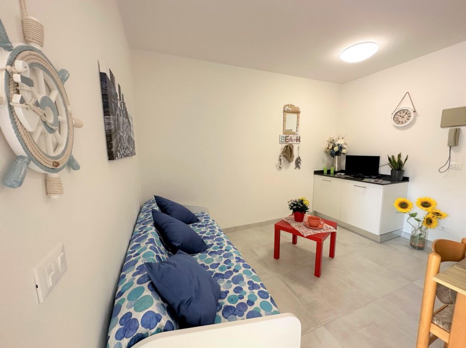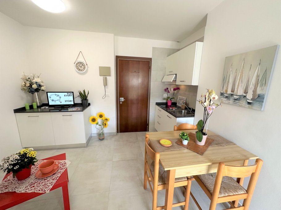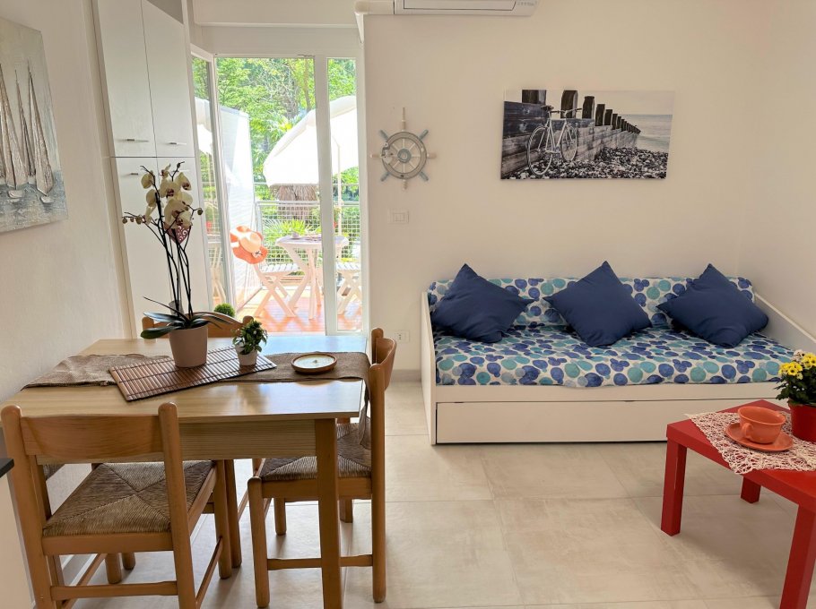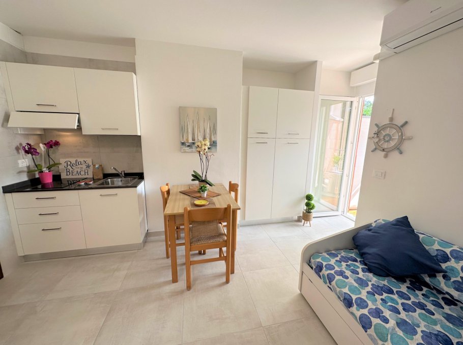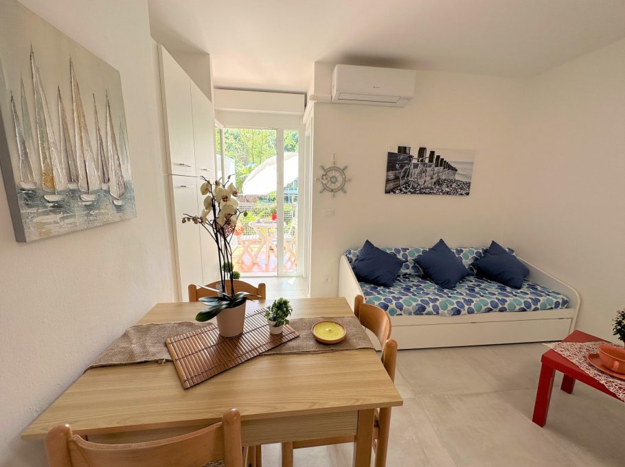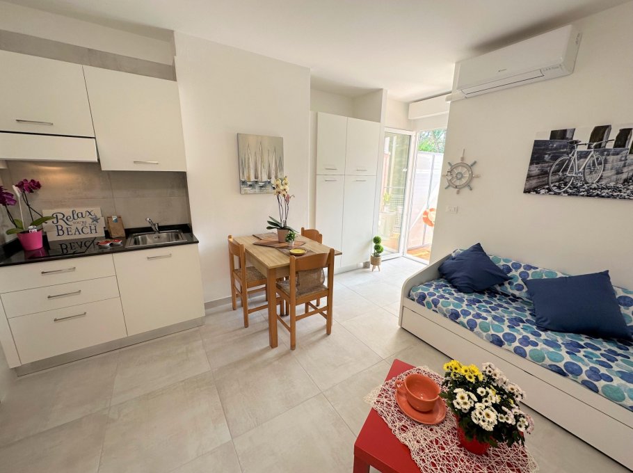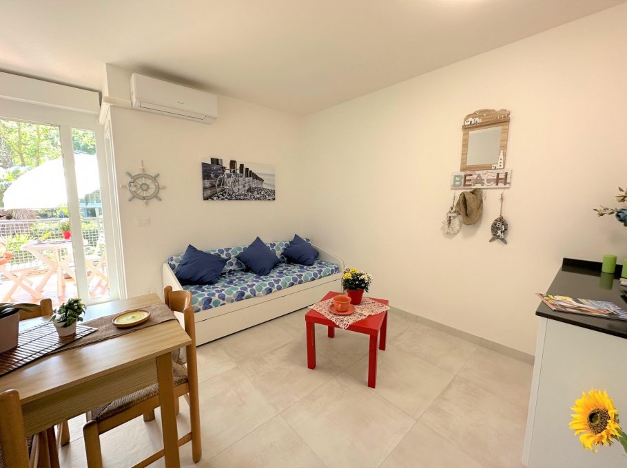Studio apartment completely renovated on the 1st floor of a small building without a lift, a stone's throw from the beach and the centre of Lignano Pineta.