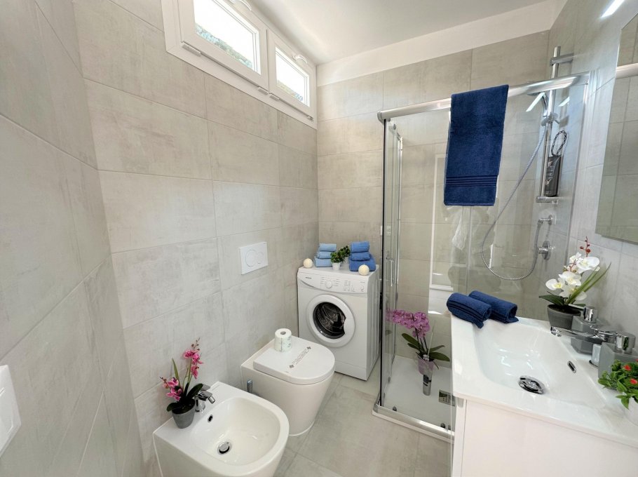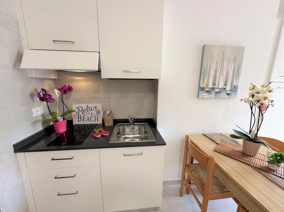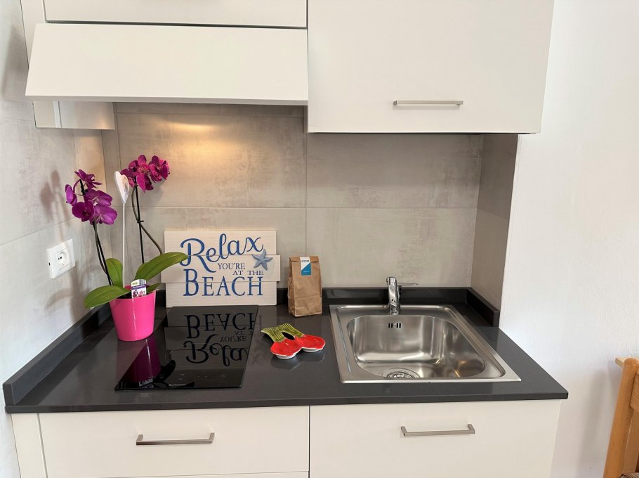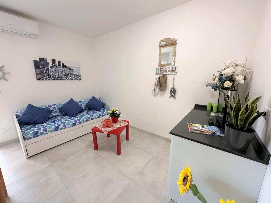 Consisting of a living room with a double sofa bed, kitchenette, spacious bathroom with window and shower, sunny terrace equipped with a plastic table and chairs, air conditioning with heat pump, washing machine, large fridge freezer, TV, American coffee machine, numbered parking space.