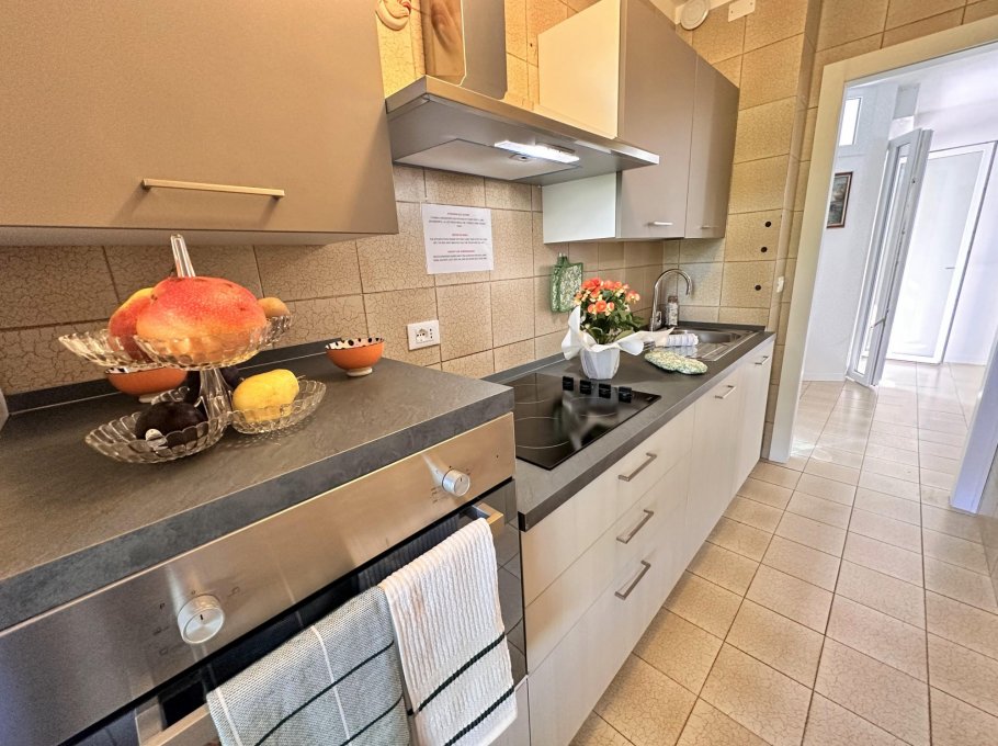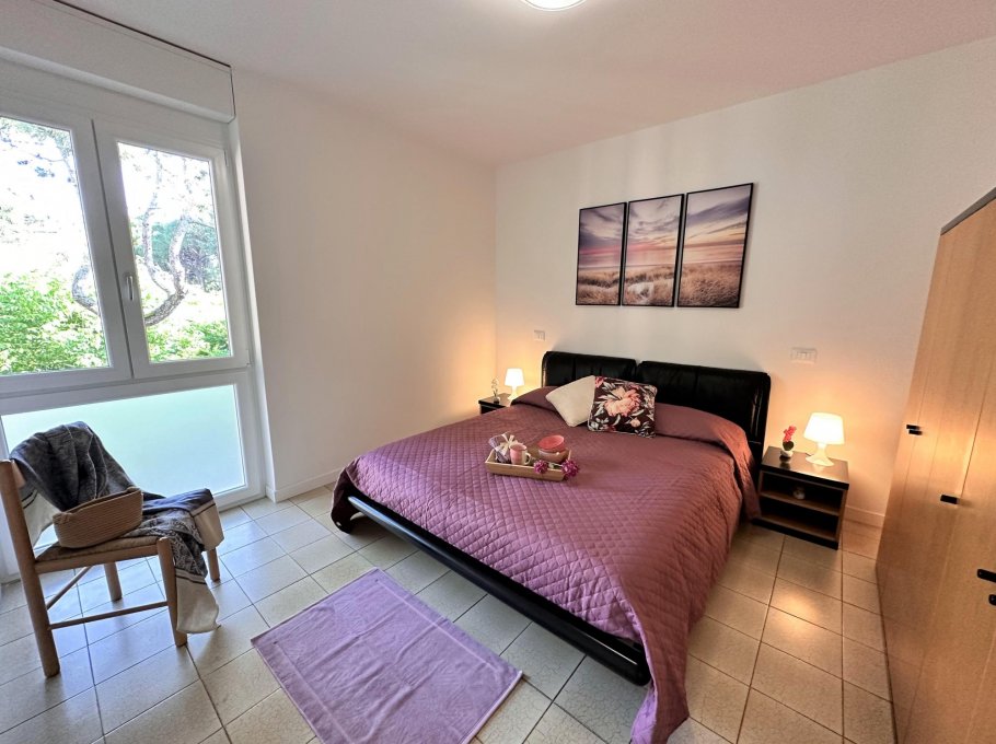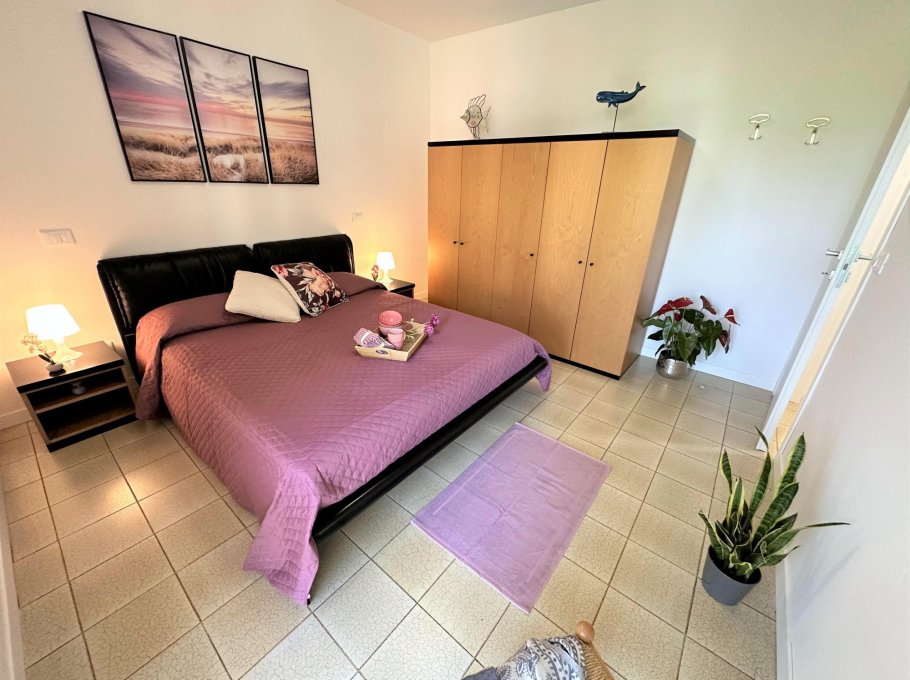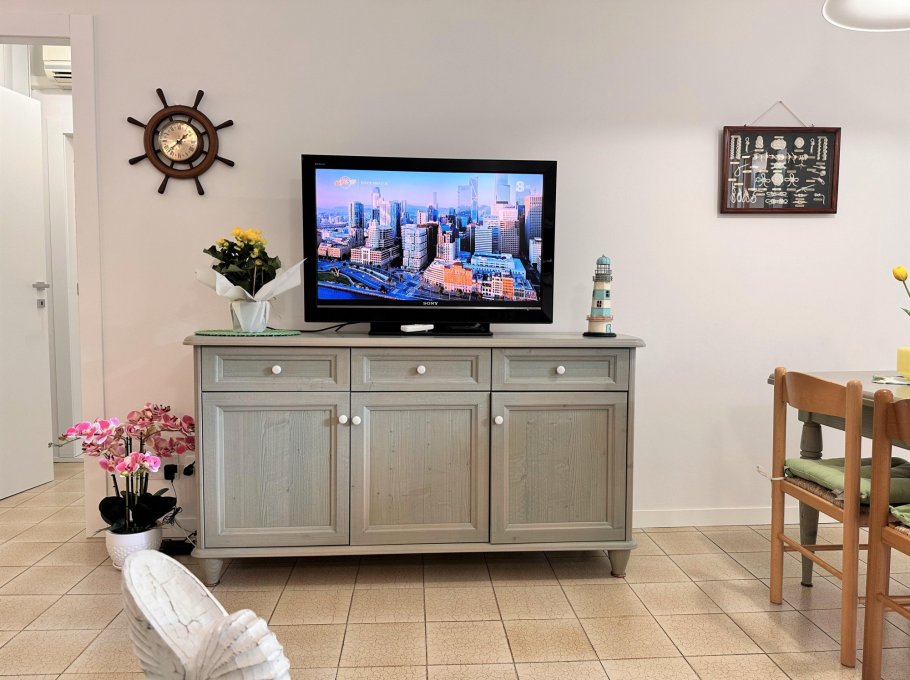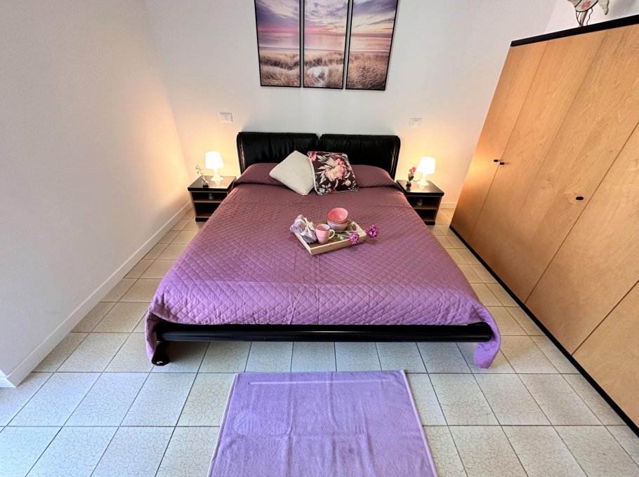Bright two-room apartment on the second floor (without lift) composed of a living room with sofa bed, extra folding bed if required, kitchen with electric hob, terrace with table and chairs, double bedroom, bathroom with window and shower. Air conditioner with heat pump.
