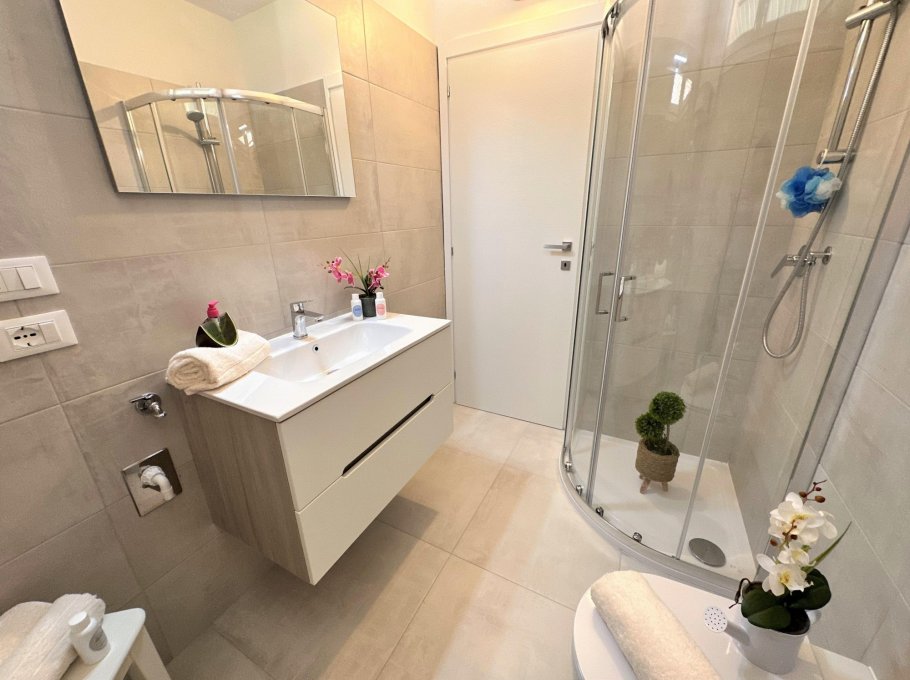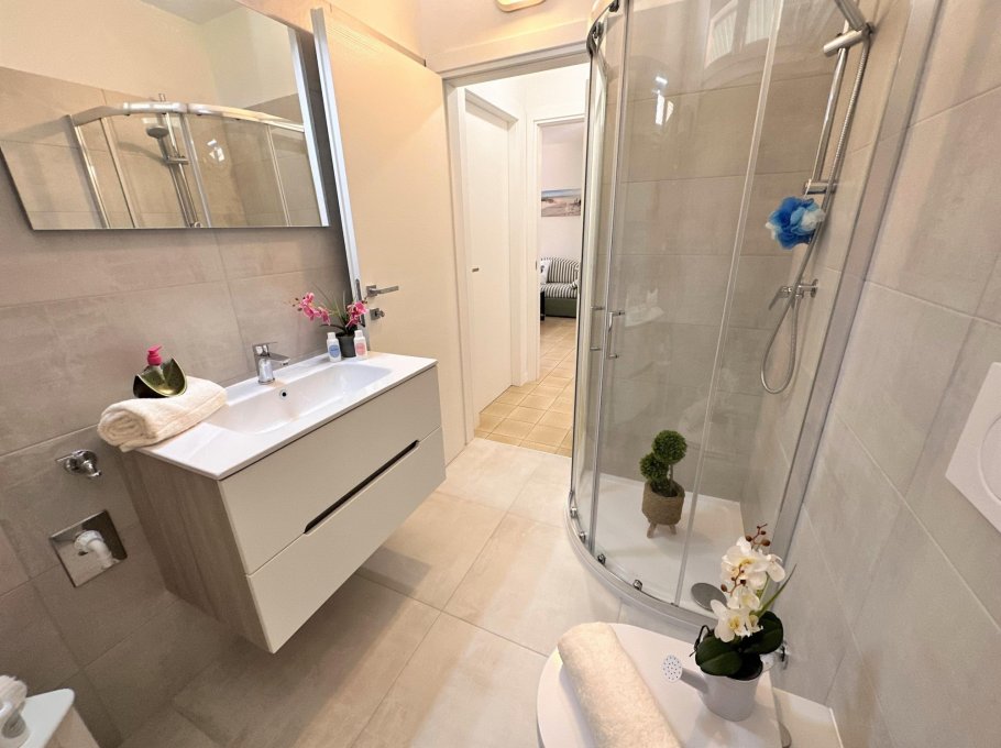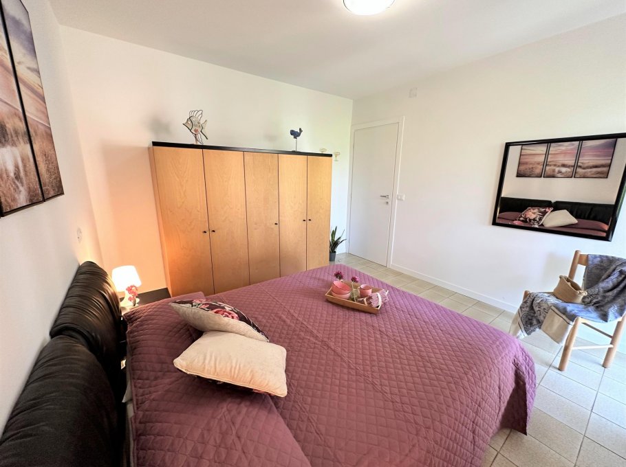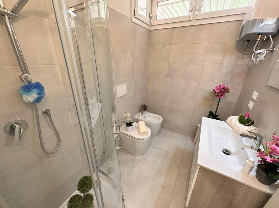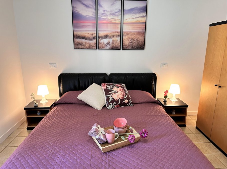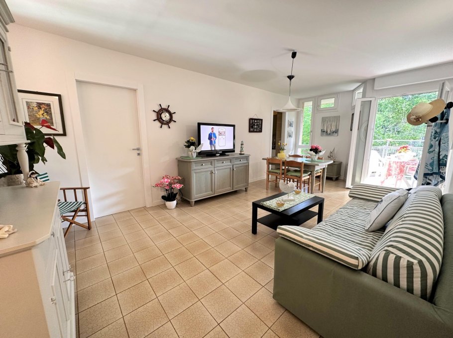 Bright two-room apartment on the second floor (without lift) composed of a living room with sofa bed, extra folding bed if required, kitchen with electric hob, terrace with table and chairs, double bedroom, bathroom with window and shower. Air conditioner with heat pump.