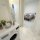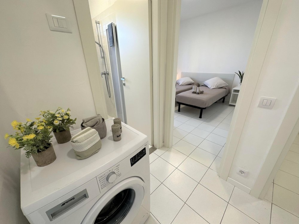 Hallway with washing machine. The apartment also has a microwave, large fridge with freezer.