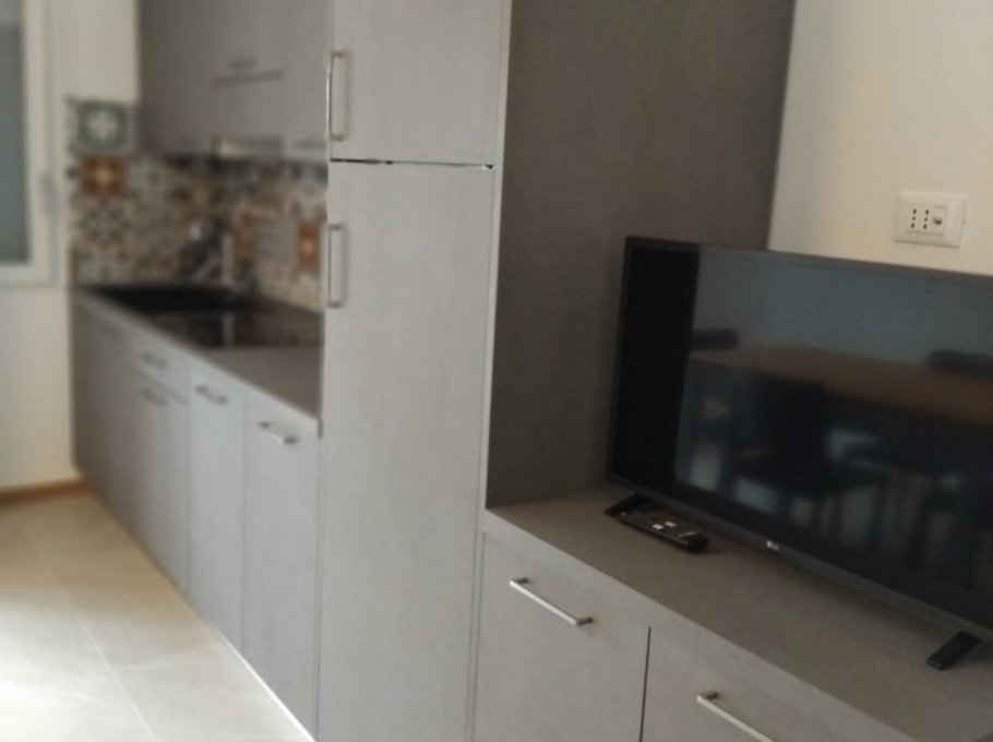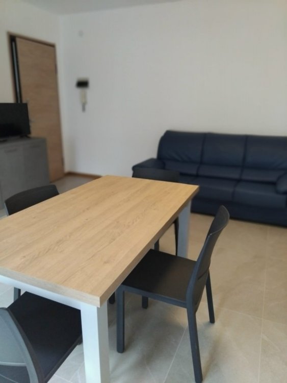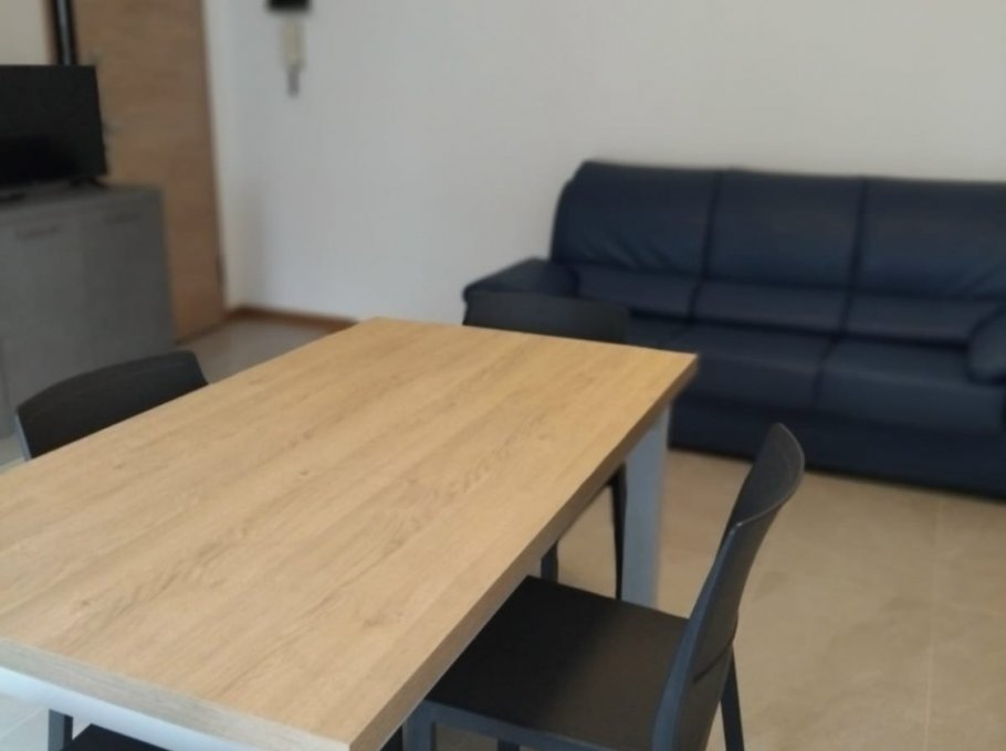 Cozy first-floor apartment, ideal for families. It features a double bedroom, a bedroom with bunk beds plus a third bed, a living room with sofa, a fully equipped kitchen, and a bathroom with shower.