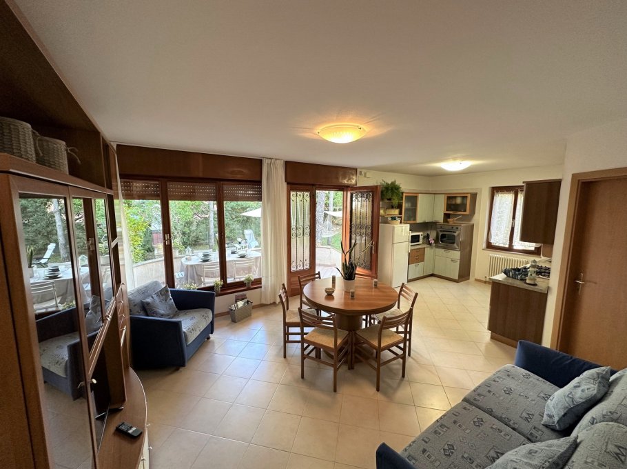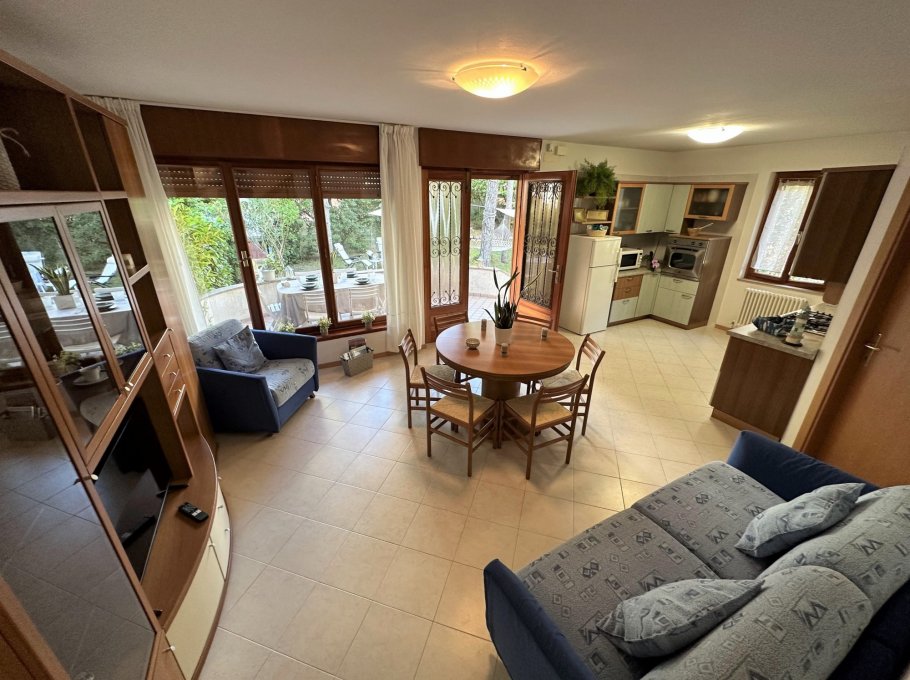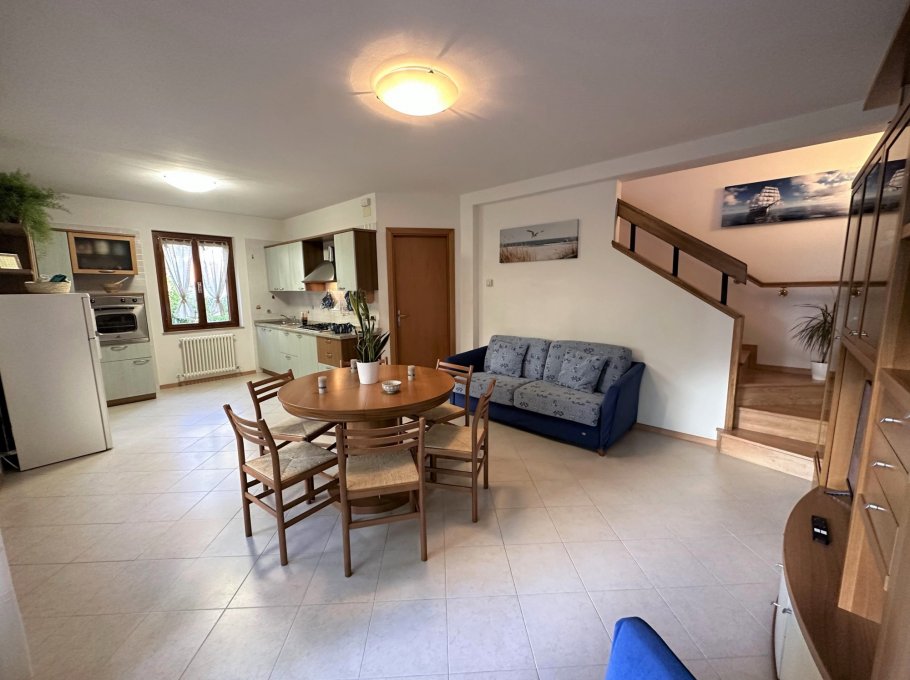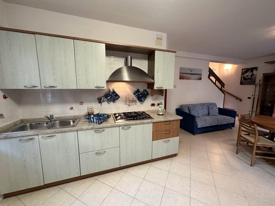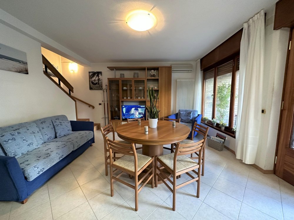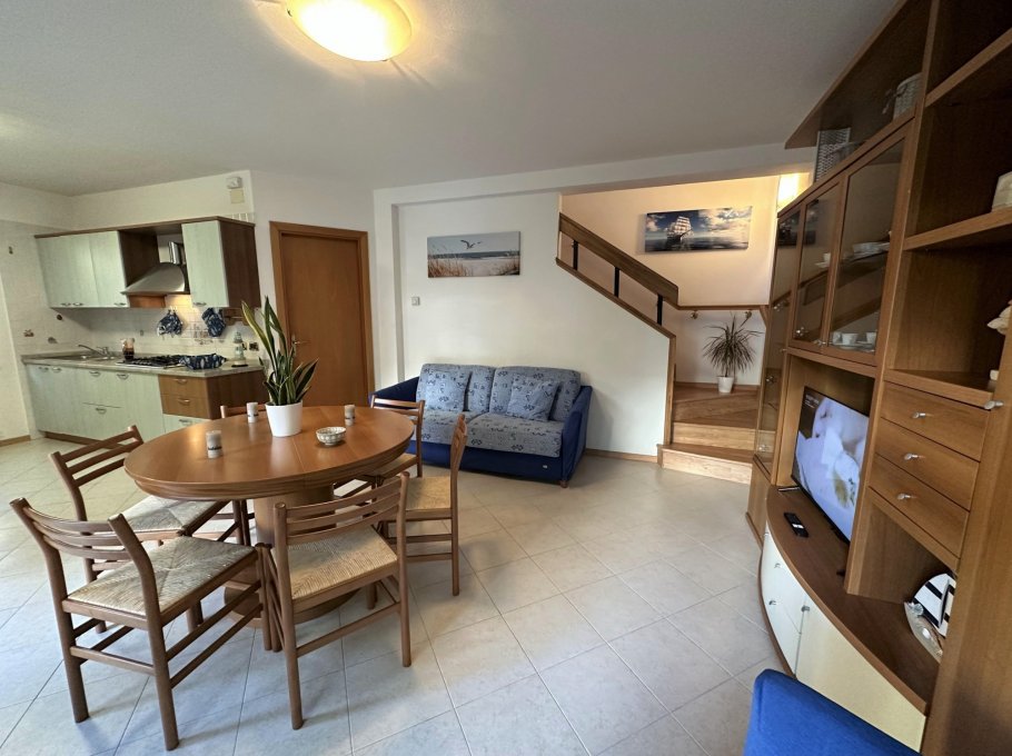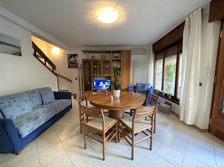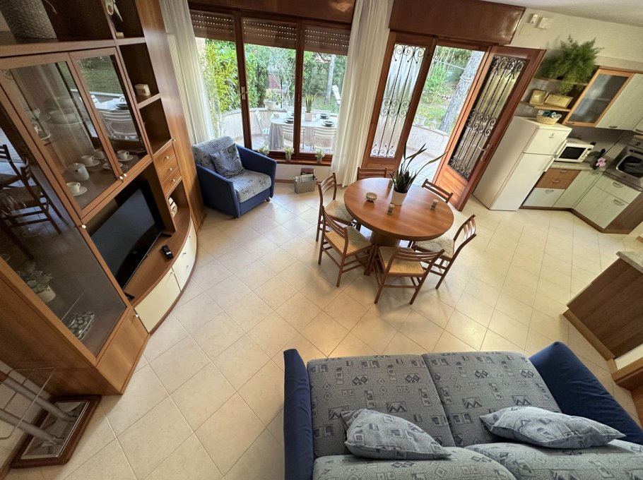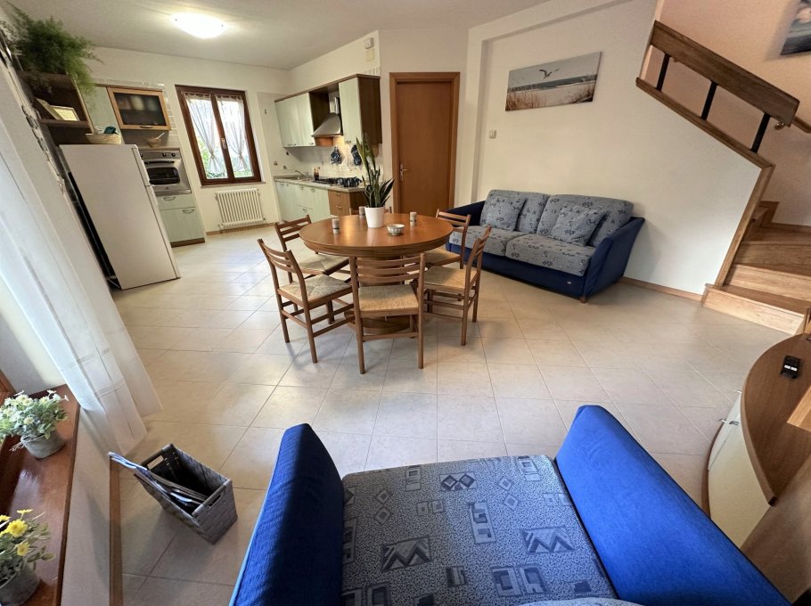 Terraced house in Lignano Pineta, in a quiet area just steps from the beach, on two levels. The ground floor features a spacious living room and kitchenette, a bathroom with a window and shower, and a closet.