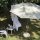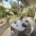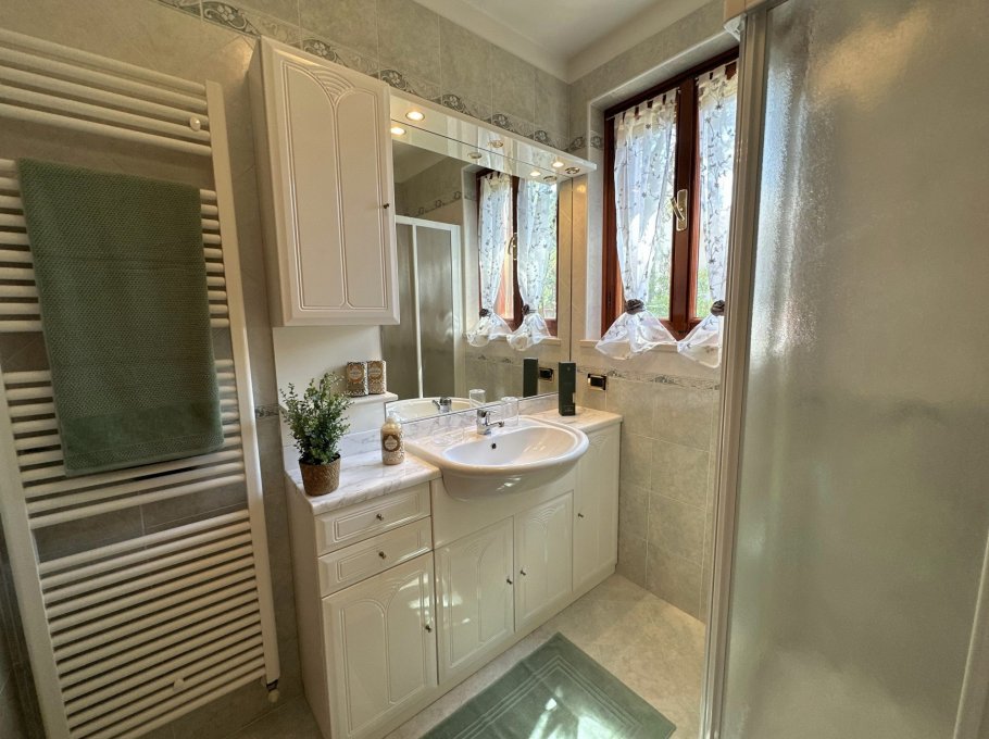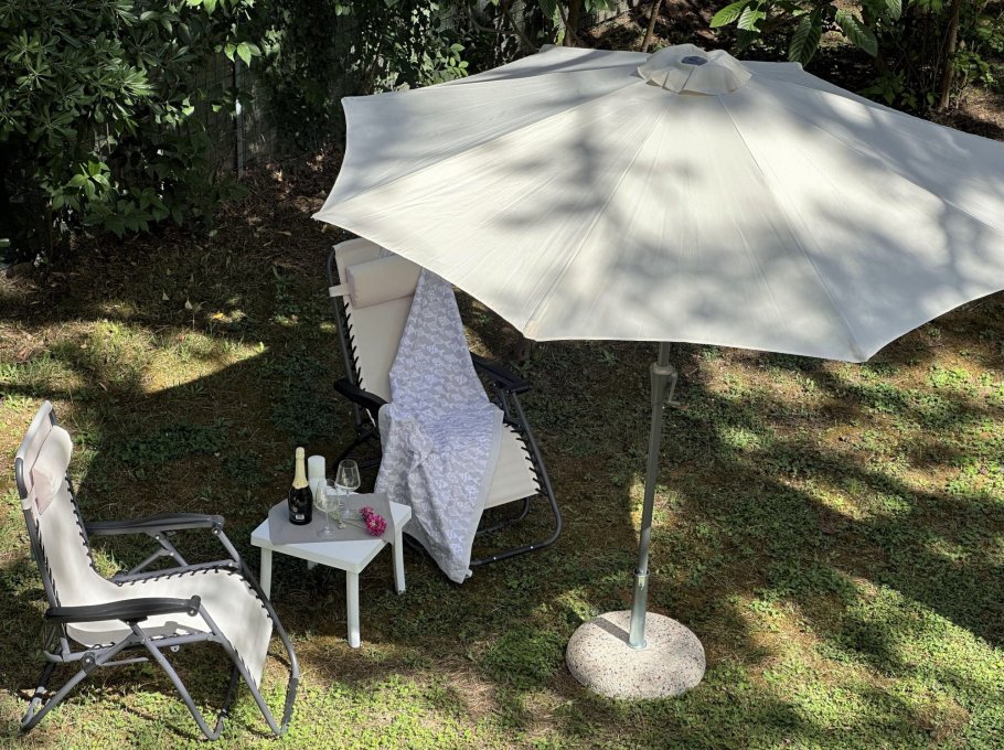 The first floor includes a triple bedroom and a double bedroom, and a second bathroom with a window and shower. It also features air conditioning (on both floors), a TV, washing machine, dishwasher, and an entrance hall with a patio furnished with a table, chairs, an awning, and a barbecue fireplace. Outdoor parking covered by a canopy inside the garden.