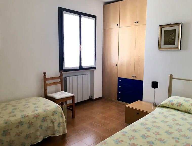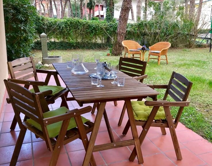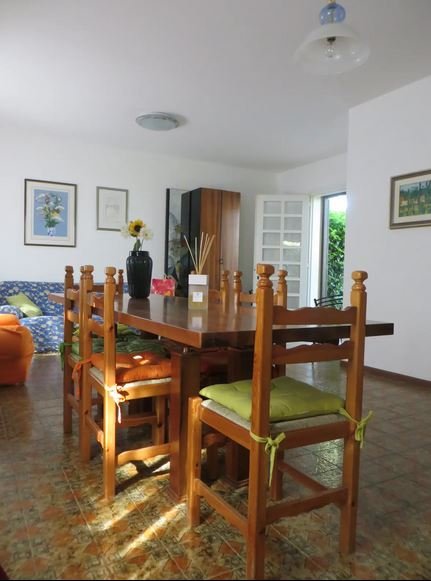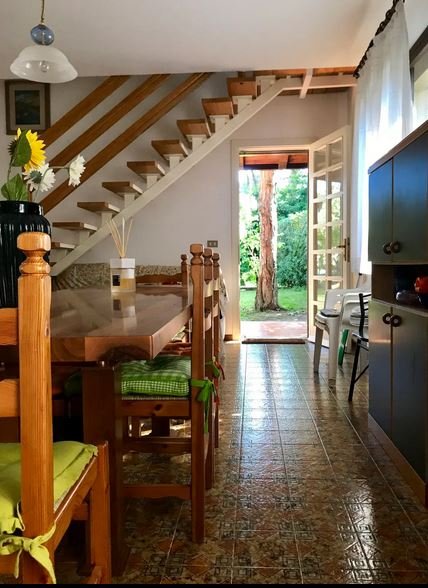 La casa è una bifamiliare con ampio giardino in pineta. Ha due stanze da letto e due bagni al piano superiore.