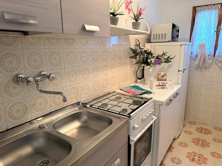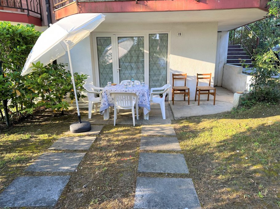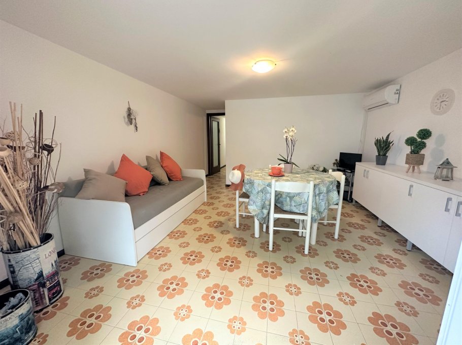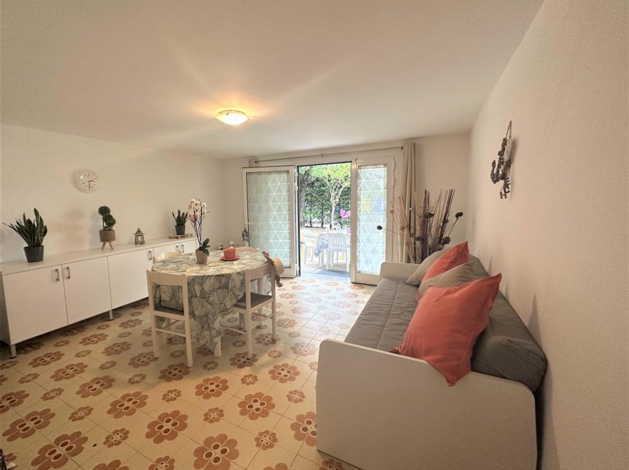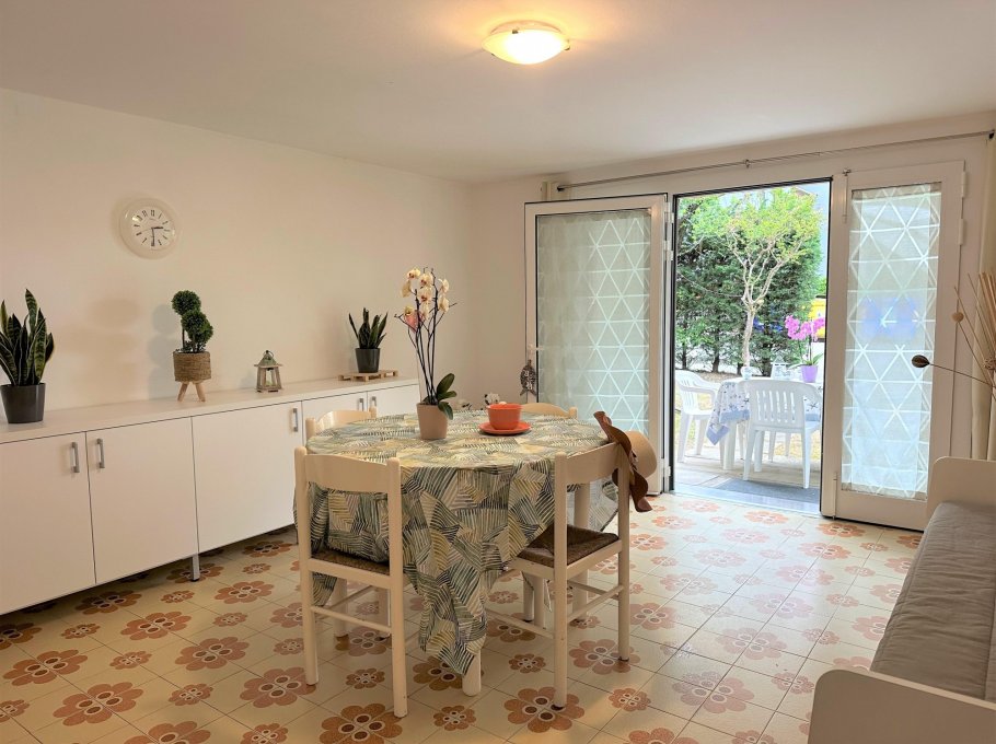Three-room apartment on the ground floor consisting of a kitchenette, living room with sofa bed overlooking the outdoor patio, equipped with table and chairs for six people.