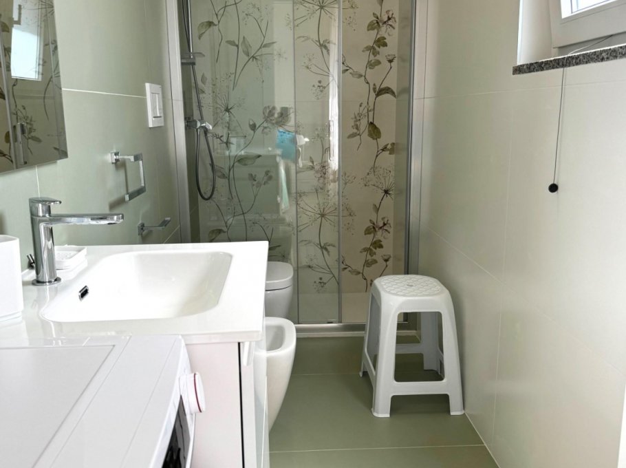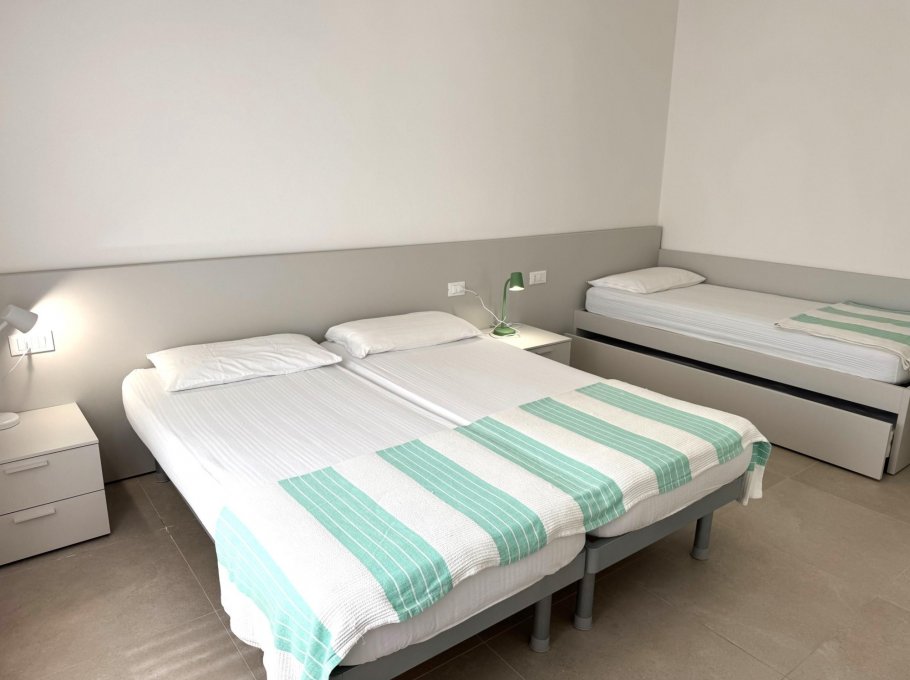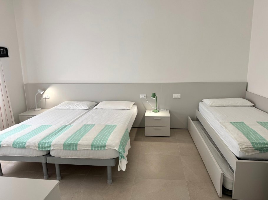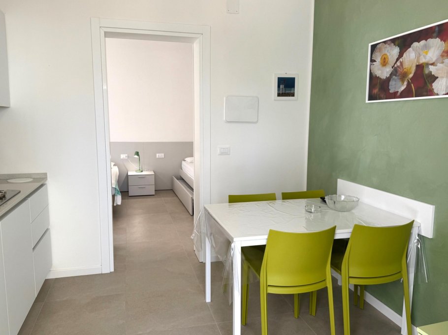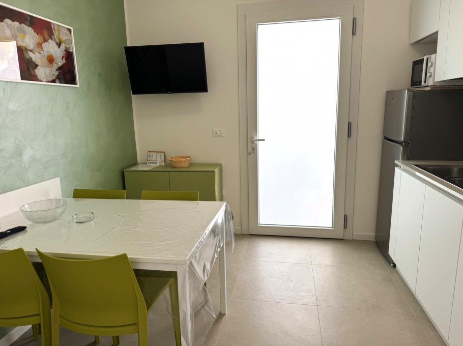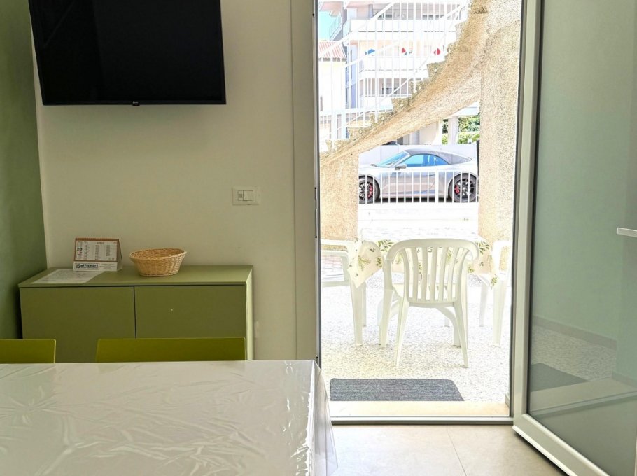 Very comfortable apartment, completely renovated in 2024. It is located on the ground floor of a small building close to the main street of Sabbiadoro, in the direction of beach offices number 8 and 9, just 250 meters from the sea. It is composed of a living room with kitchenette, bedroom with four beds (one double and two singles), bathroom with box shower and window, terrace. It also has a washing machine, air conditioning, WI- FI and numbered parking space inside the building.