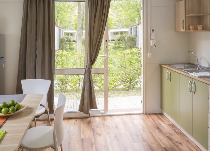 Mobile home L is one of the biggest Mobile home on our camping. It is suited for families or friends up to 6 persons and has air conditioning. It’s simile to a caravan- dimension: 23 square meters. It has a terrace made of wooden tiles with a table, 6 chairs, 2 deck chairs and a big sun umbrella. Once inside the Mobile home L you will find a living area with the kitchen and a corner to eat. By lowering the table you will create the 6th bed.