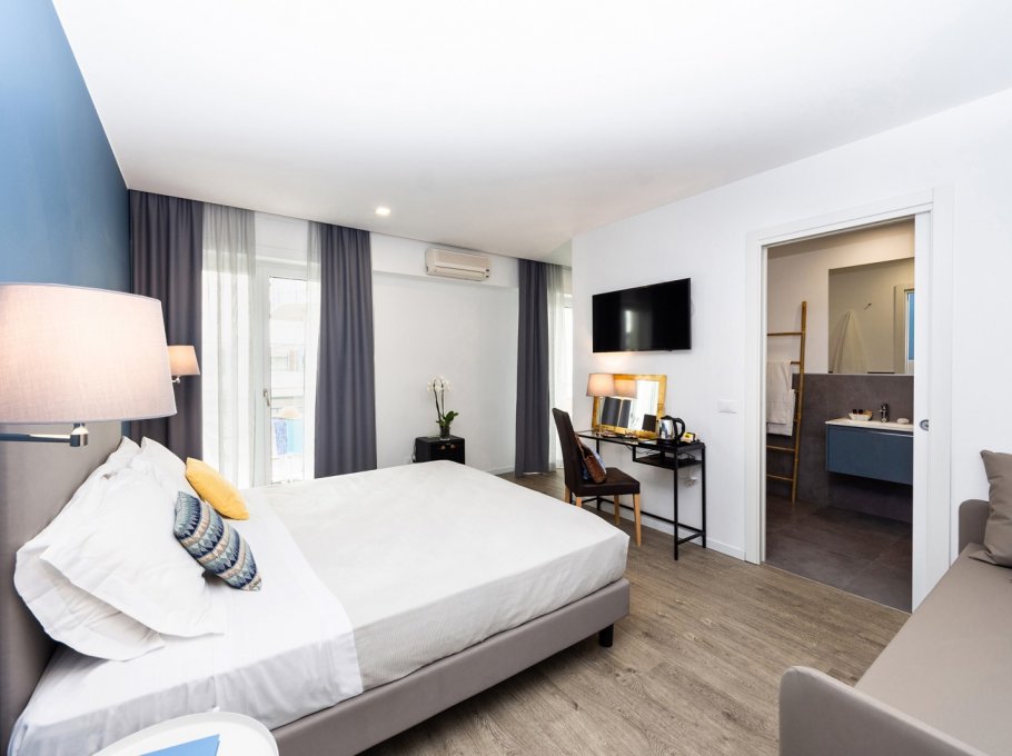 Camera con servizi, telefono, TV-sat,climatizzatore e cassaforte, phon. Senza terrazzino.