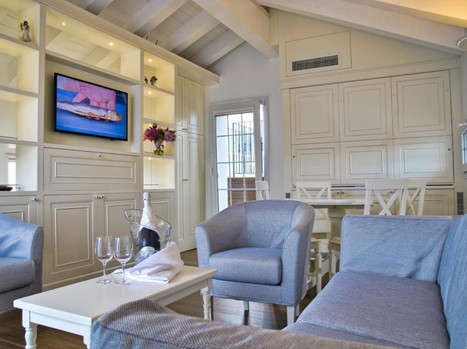 Suite of 48 sqm on two levels, with 1 double room with balcony, windowed bathroom with shower, living room with sofa bed, balcony, furnished terrace with beautiful view on the harbour. Also it’s equipped with 2 LCD satellite TV, free Wi-Fi, safe, telephone, air conditioning and heating.