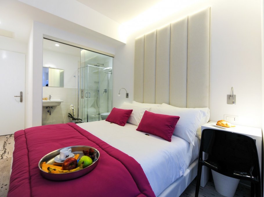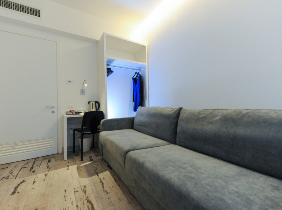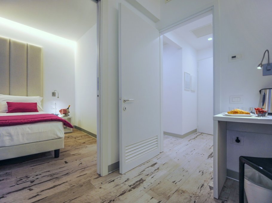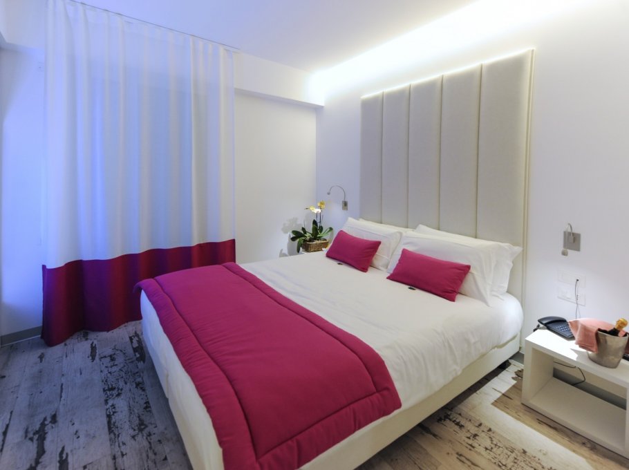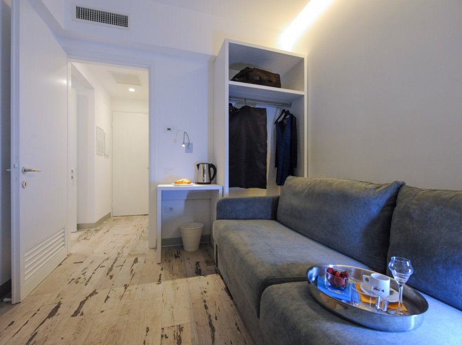 Ciascun complemento delle camere è disegnato su misura, con arredo in stile contemporaneo, adatto alla clientela più esigente.