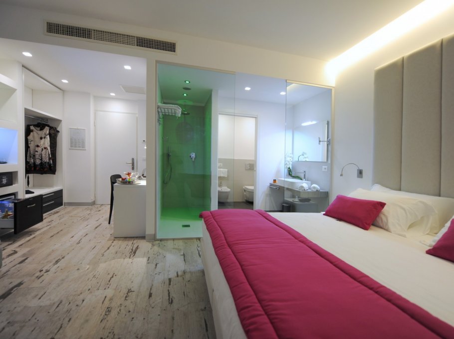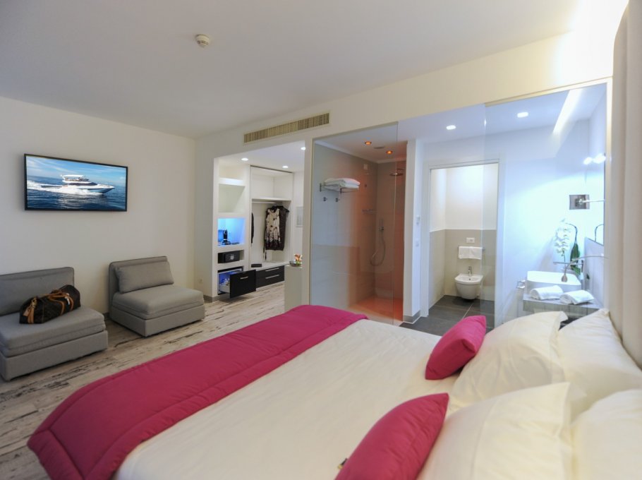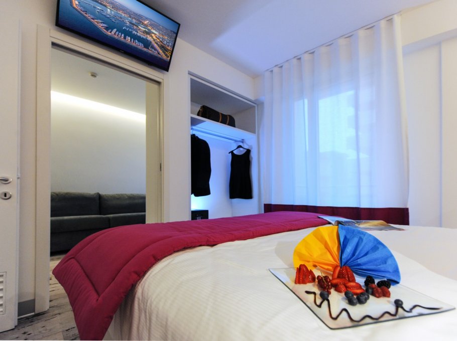 Composte da ampie camere da letto , le Junior suite dell’Hotel Lampara hanno una superficie che varia dai 20mq ai 28mq e dispongono di un confortevole letto matrimoniale di 180 cm X 200 cm (o due letti singoli 200 cm x 90 cm con possibilità di unirli), corredato di 4 cuscini e di un materasso Simmons Privilege Beauty per una migliore qualità del sonno. Ogni camera gode di un differente scorcio panoramico (vista mare – vista laterale della Terrazza a Mare – vista su viale Gorizia , cuore pulsante della movida lignanese).