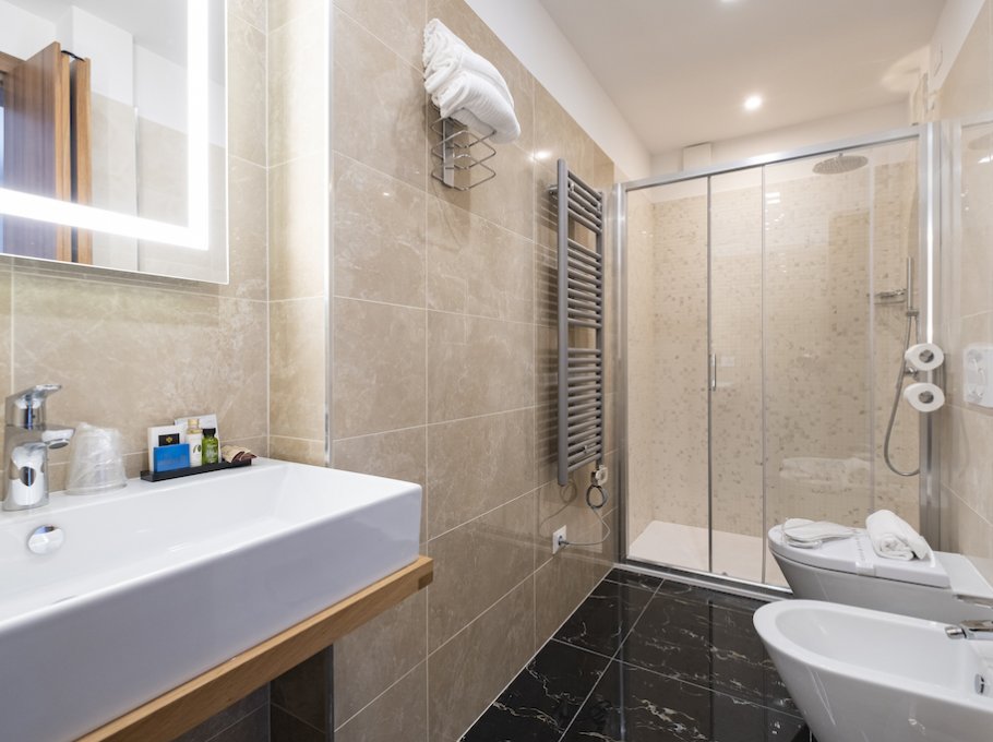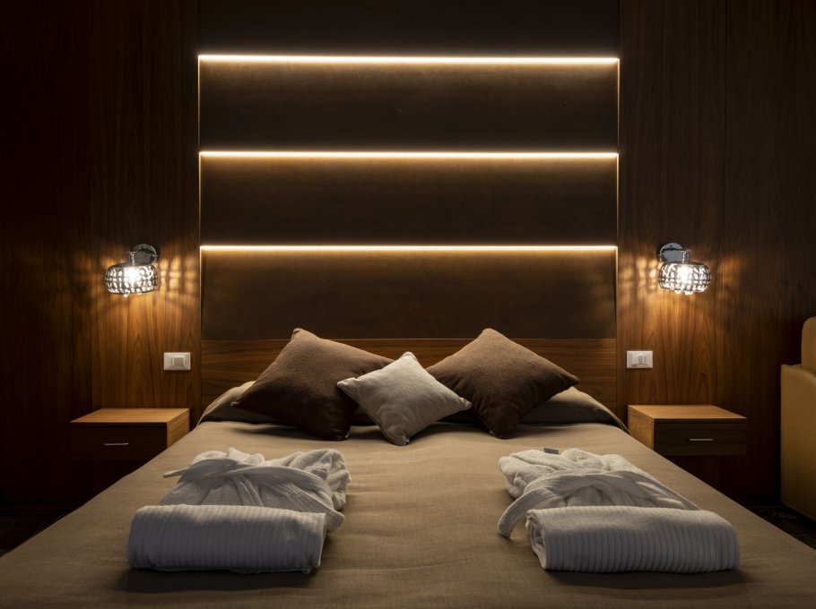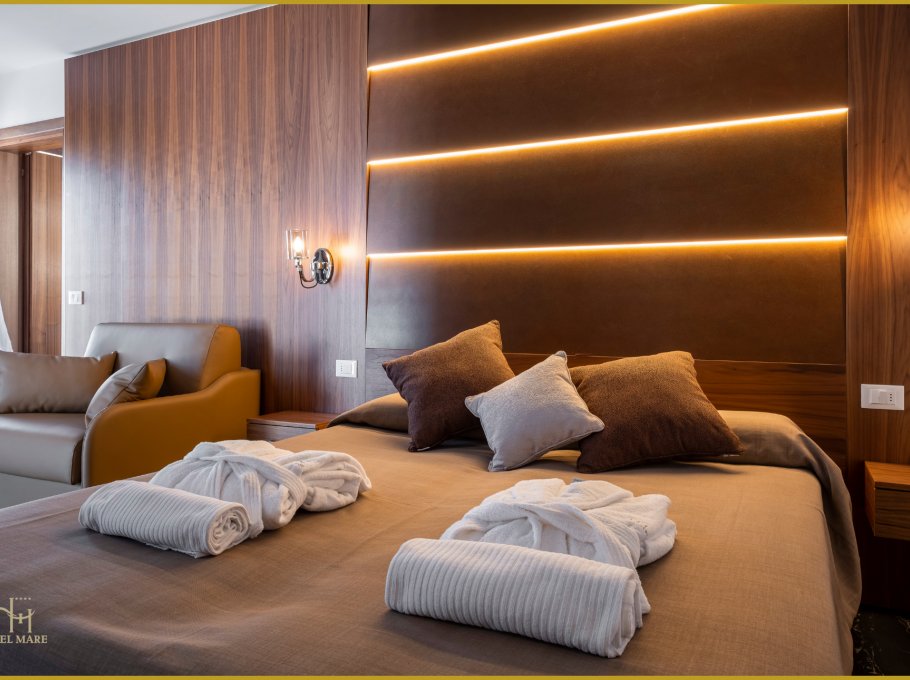 Our spacious Junior-Suites with Terrace / Balcony and spectacular views of the Darsena and Lagoon are all located on the 4th floor of approx. (26 m2) are composed of a king-size double bed and a sofa bed with quality mattresses equipped with a 52 ″ LCD satellite TV, kettle for tea and coffee, safe, minibar, air conditioning, individually controlled heating, Wi-Fi, Bathroom with WC, bidet, Led make-up mirror bathroom set some rooms have a view of the sea and others of the lagoon designed to meet the various needs of each guest, carefully furnished and equipped with small features that make the environment comfortable. All our rooms are no smoking and soundproofed.