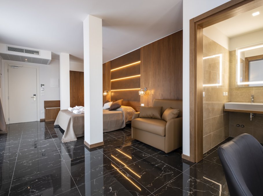 Junior Suites with double balcony facing Harbour are approx. (29m2) with spectacular views of the Old Harbour and Lagoon with double bed and double sofa bed ideal for 2 adults + 2 children or for 3-4 adults bathroom with Wc Bidet and shower box LED mirror for make-up elegantly furnished with quality mattresses TvSat wifi minibar,adjustable air conditioning-heating are designed to meet the various needs of each guest with ceramic floor All rooms are soundproofed.