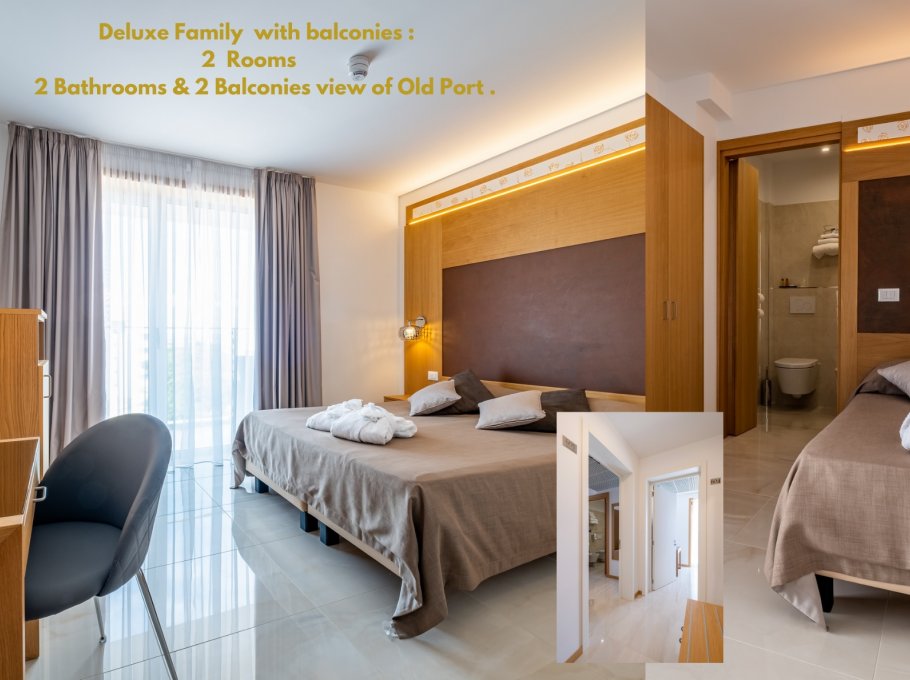 Deluxe Rooms with large balcony and spectacular views of the Old Port, Lagoon and some with sea view approx. (17-19m2) consisting of double bed quality mattress equipped with 42 ″ LCD TV safe, mini bar ,air conditioning heating individually adjustable Wi-Fi bathroom WC Bidet and shower box Hairdryer and LED mirror for make-up all our rooms are designed to meet the various needs of each guest with soundproofed ceramic floor furnished with care and equipped with small features that make the environment comfortable.