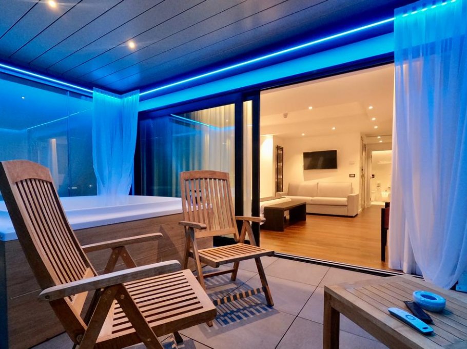 (30 square meters) Composed of a double bed that can not be separated, double sofa bed, walk-in closet, bathroom with Jacuzzi shower box that has chromotherapy, shatsu, music, private solarium of 40 sqm including outdoor shower and sun loungers overlooking in via Udine.